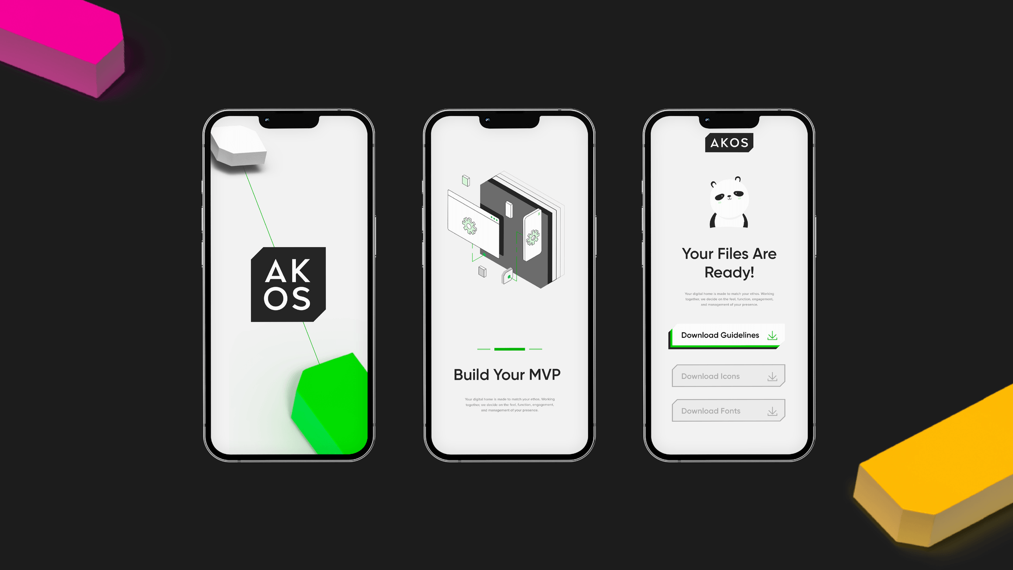 The AKOS logo and typeface were updated to make it more suitable for a development agency that provides sharp scalable solutions. The odd 45.5-degree angles of the container were refined to a perfect 45 degrees, the unnecessary period was removed, and a custom upright typeface was introduced — allowing the mark to scale effortlessly to fit any space.