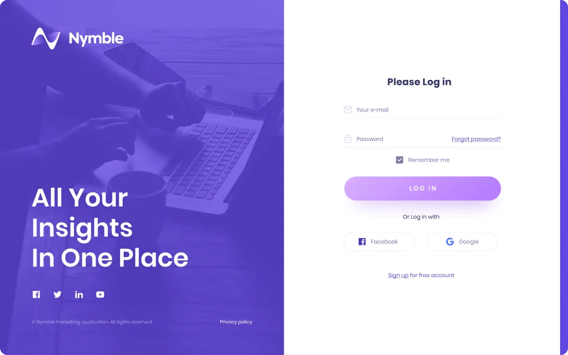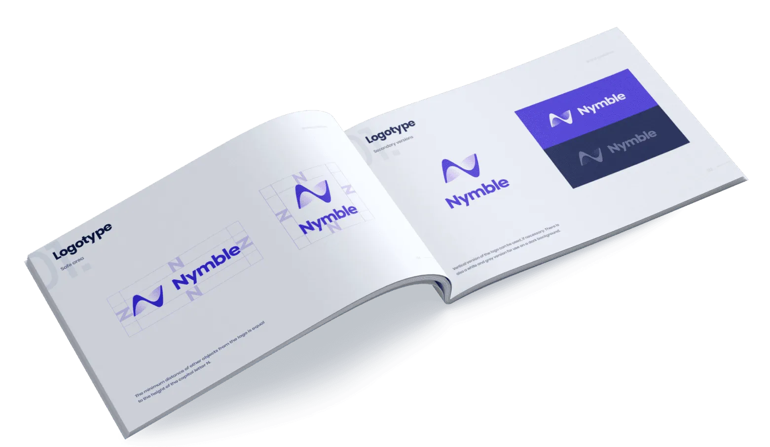 The main company logo is a font-based wordmark with a custom icon. The wordmark emphasises Nymble’s succinct and catchy name, emphasising the modern look of the logo. The geometric icon is a combinaion of analytics graphs combined with Nymble’s initial. The icon has a subtle 3D effect though use of gradients.