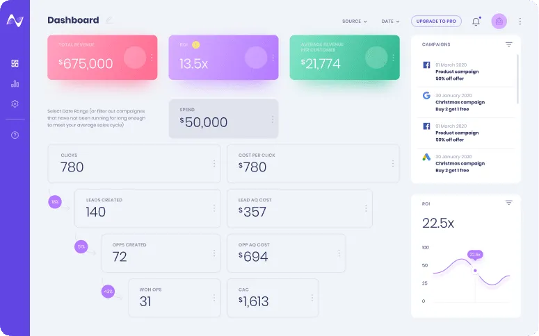 The application itself allows users to view all their ongoing campaigns and associated data such as acquisition cost, opportunity & ROI of campaigns and total spend.