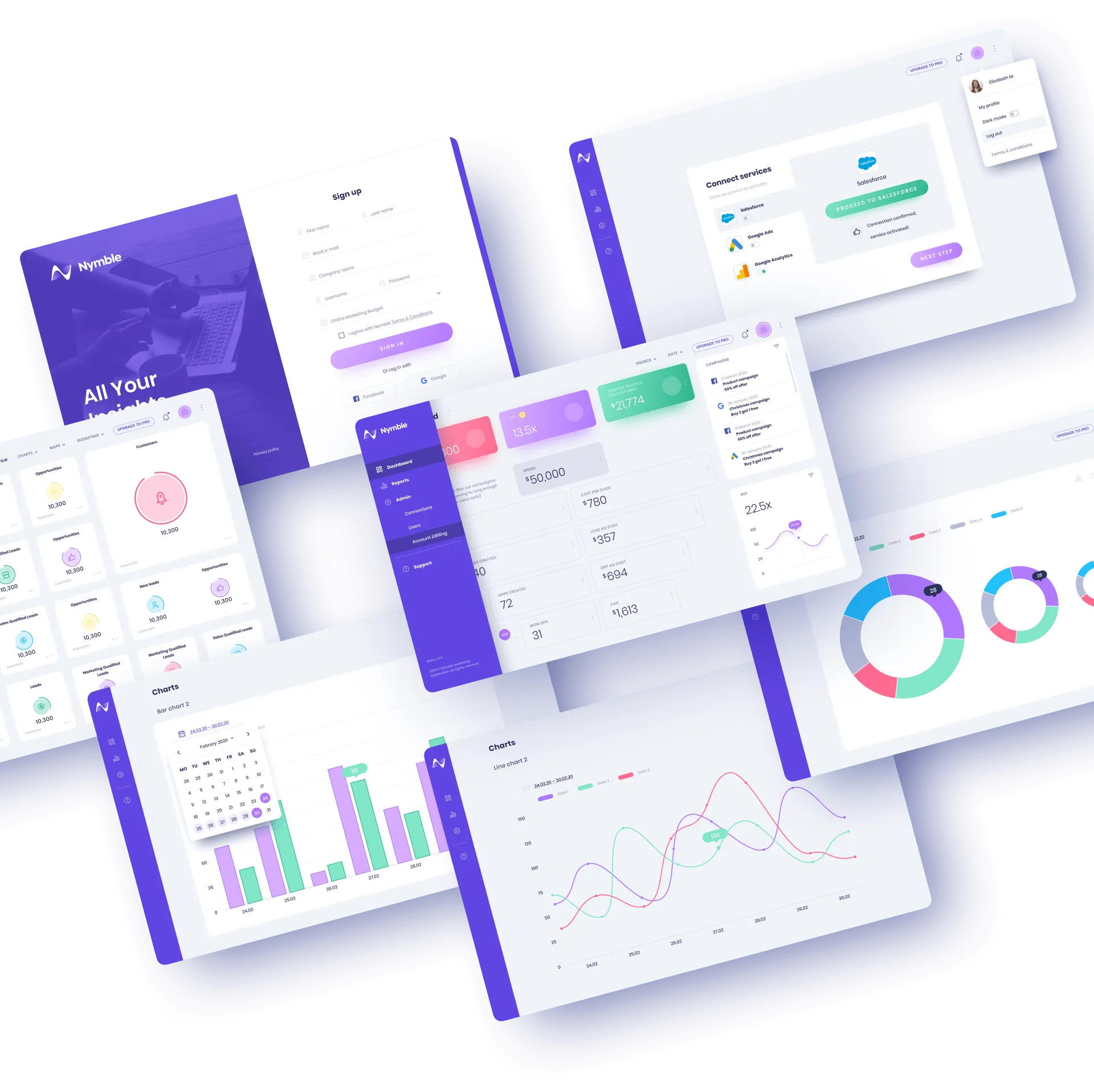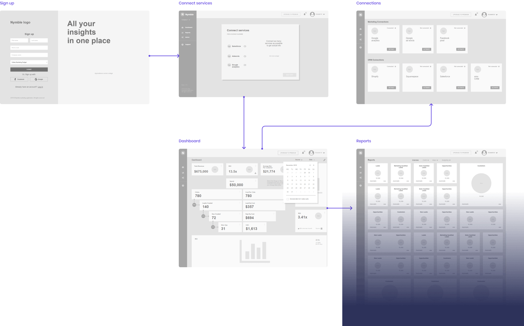 We began the process of designing their application with a wireframing stage to identify the most important elements to include on their dashboard. For example, an important consideration is for users to be able to easily connect their various analytics accounts to Nymble, as well as the structure and hierachy of all reports and stats.