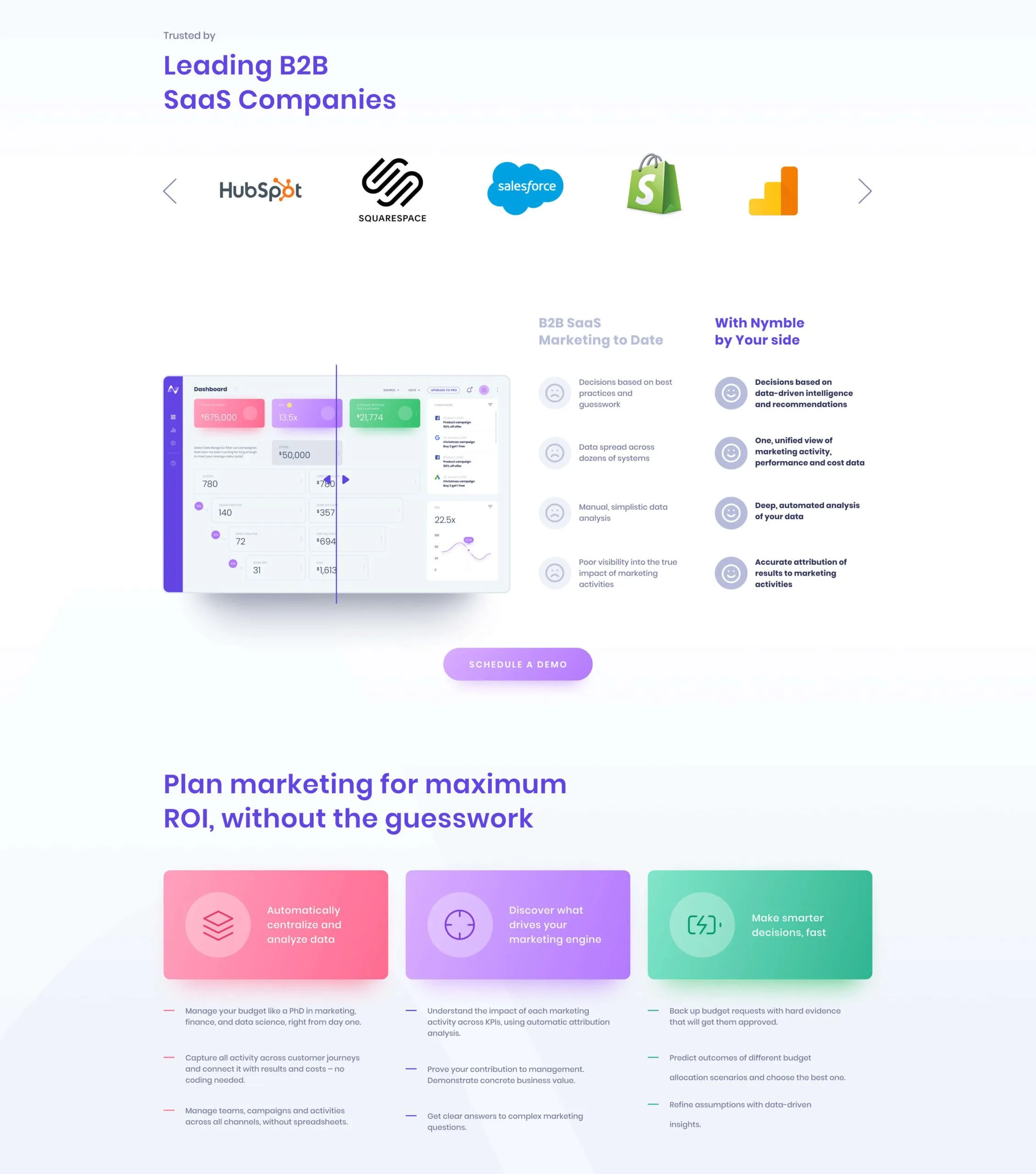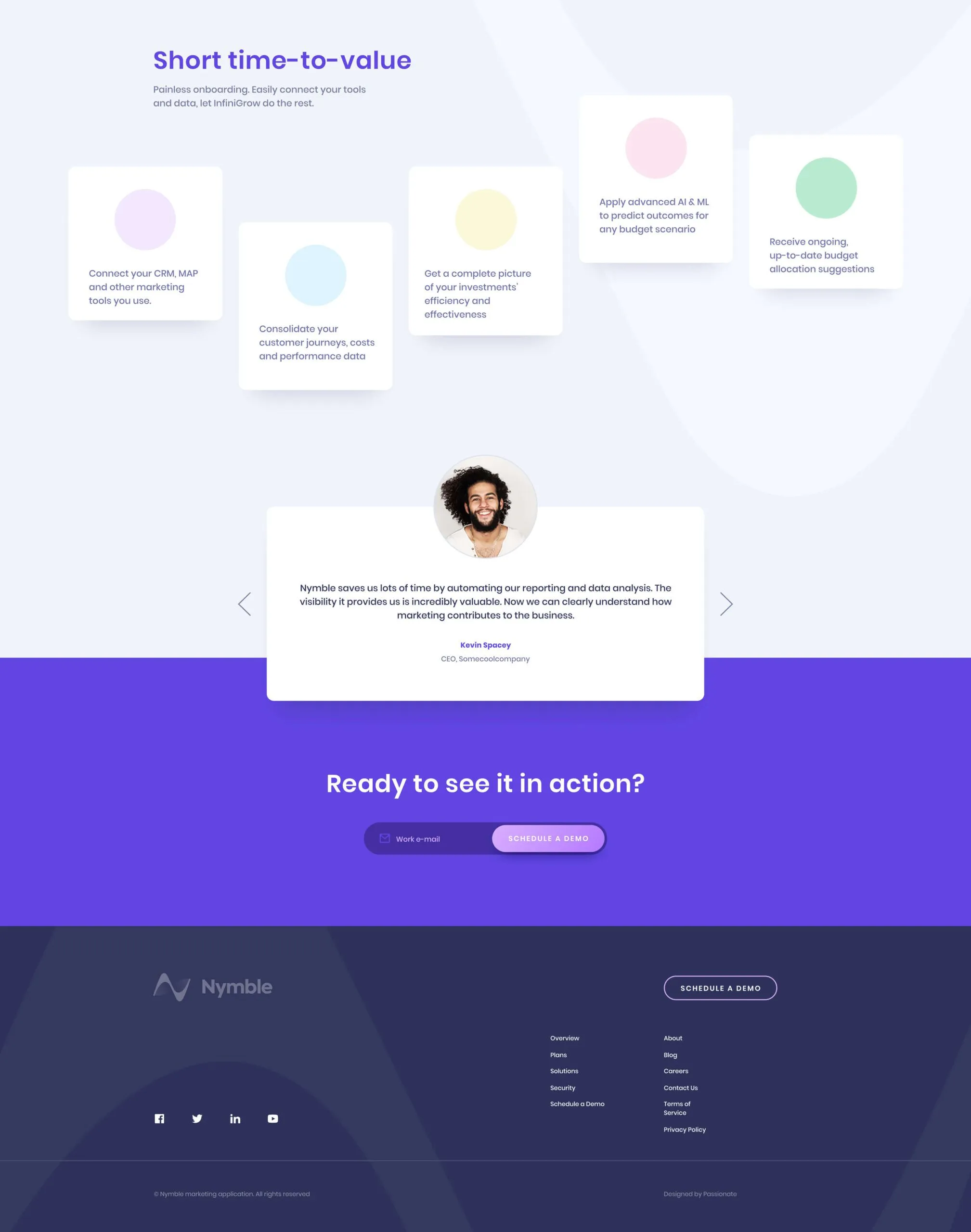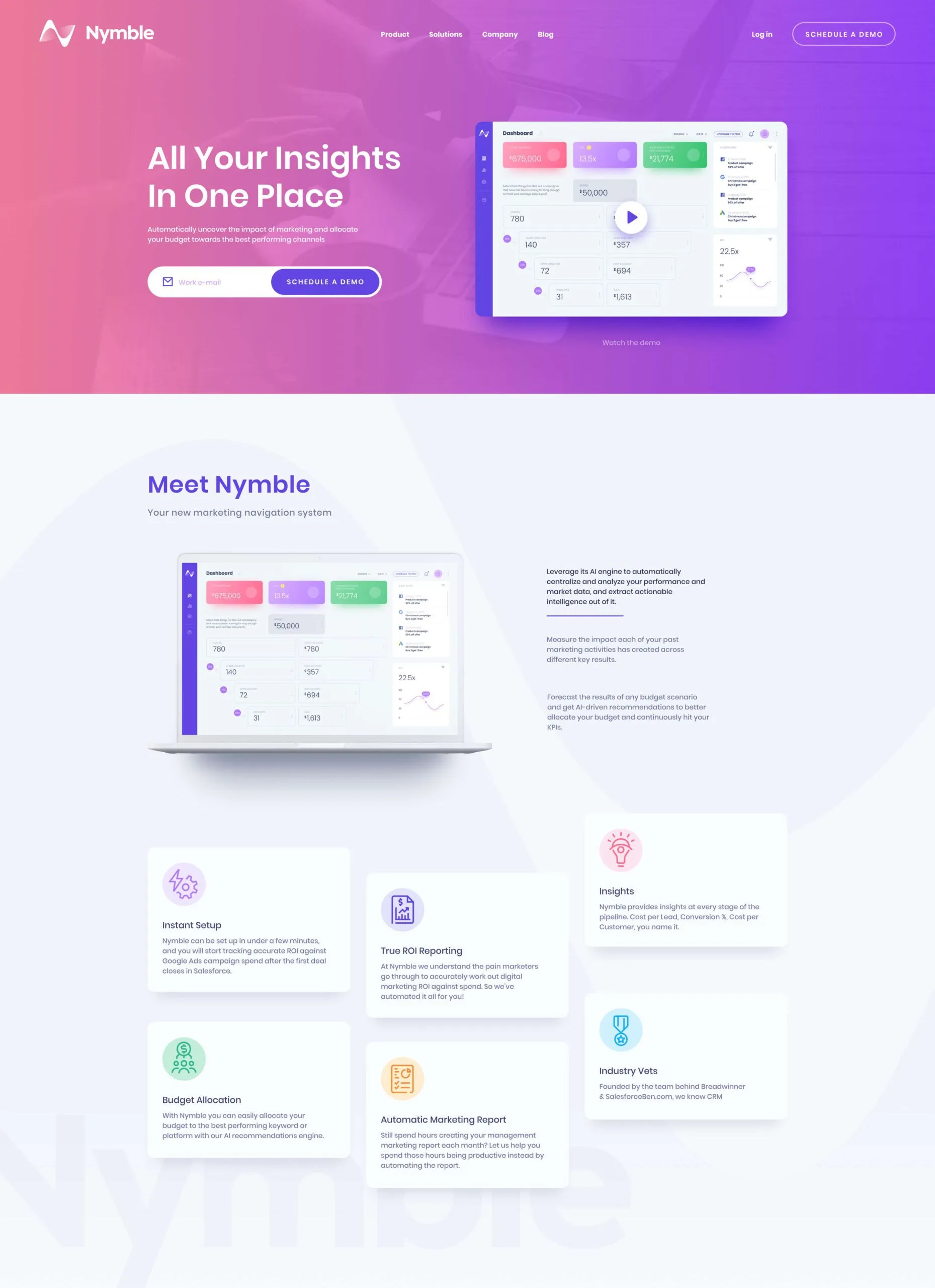 An animated product demo in the hero section clearly conveys the value users can get from using Nymble. There is one clear CTA prompting users to schedule a free demo. The rest of the page demonstrates all of Nymble’s features.